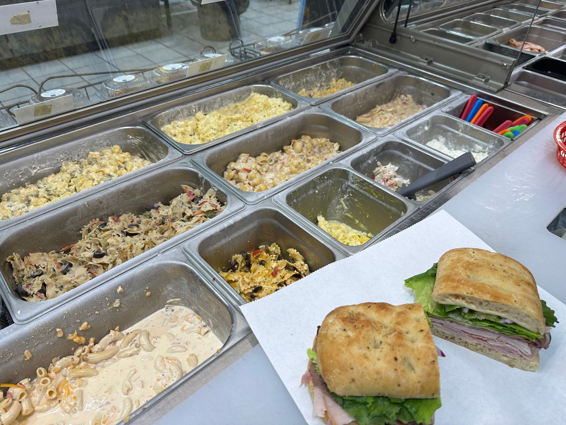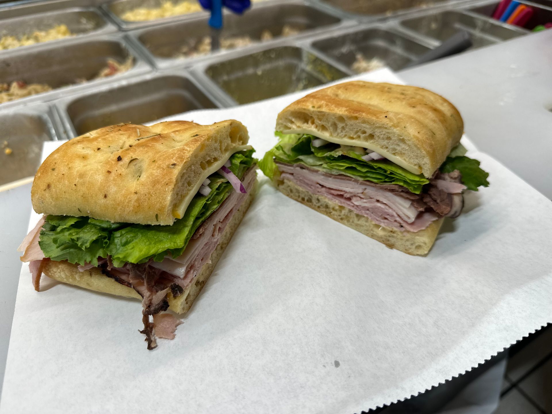 Garlic Summer Sausage, Ham, Roast Beef, Lettuce, Tomato, Creamy Vinaigrette on toasted Schiacciata with Rosemary bread