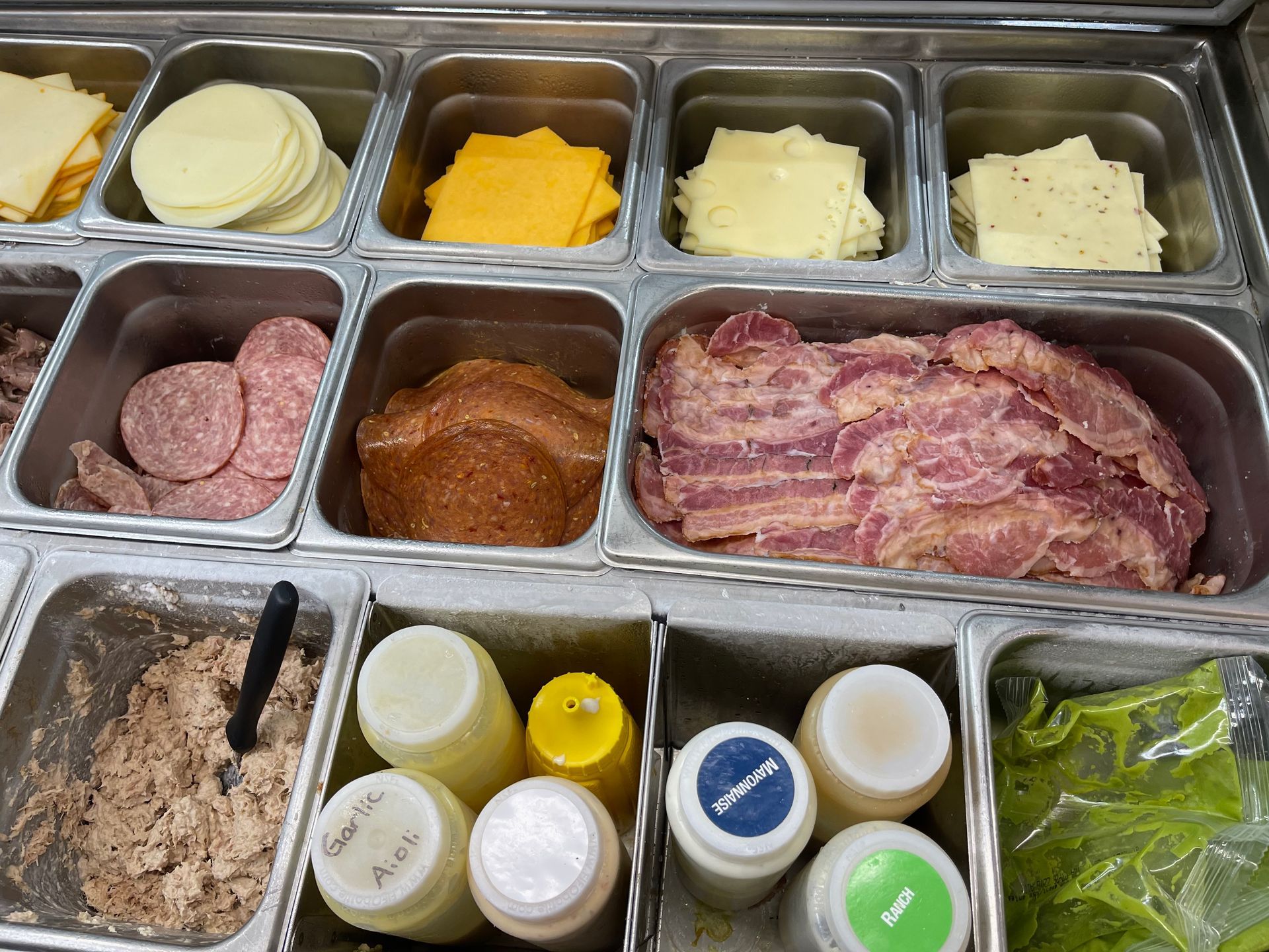 Garlic Summer Sausage, Turkey, Bacon, Pepper Jack Cheese, Lettuce, Onions, Mayo
